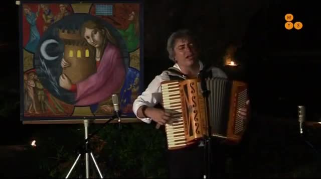 In the tradition of the “cantastorie” of old, Daniele Mutino sings the legend of St. Barbara, using a poster to illustrate some details